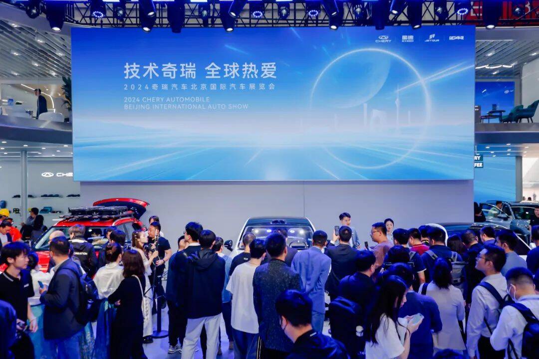 图为2024北京国际车展上3000多名海外友人集聚奇瑞展区观看发布活动