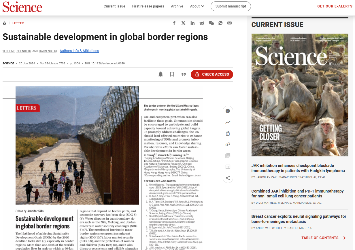 2024年6月21日,《Science》发表题为“Sustainable development in global border regions”(全球边境地区的可持续发展)的评论性文章。