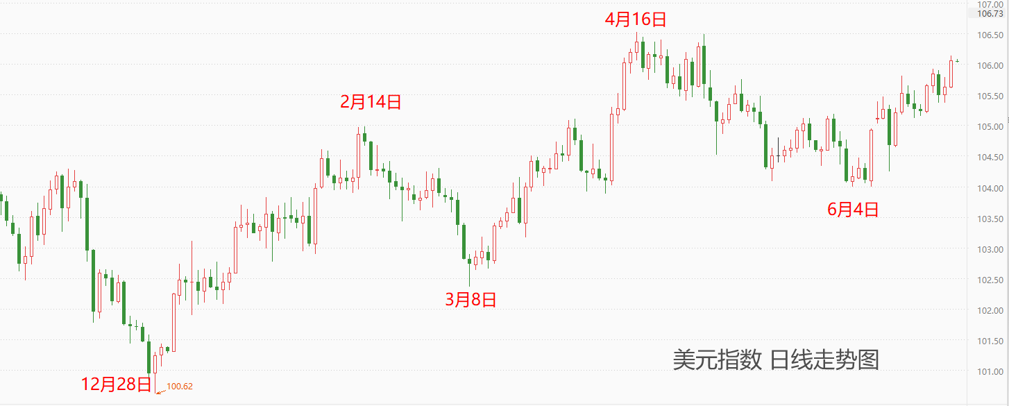 去年12月28日至今,美元指数同样处于持续的上涨态势,2月14日至3月8日的回调和4月16日至6月4日的回调,都能够对USDJPY的回调一一对应。近期,美联储官员纷纷放鹰,比如美联储理事鲍曼讲话称,通胀水平将在一段时间内保持高位,现在还不适宜降息;圣路易斯联储主席布拉德讲话称,尽管最新公布的美国通胀数据燃起了9月降息的希望,但仍预计美联储货币政策宽松的步伐将会是缓慢的。正是这些密集的鹰派言论,才驱动美元指数不断走高。