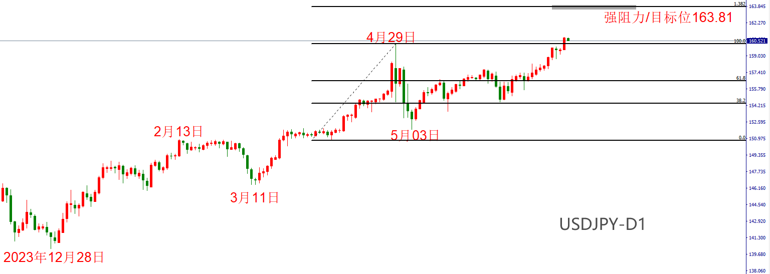 2023年12月28日至今,USDJPY处于持续上涨态势,期间虽有显著回调,但最终多头都能够收复失地并再创新高。除非日本央行的连续加息的预期异常强烈,不然USDJPY的涨势仍将延续。2月13日至3月11日的回调走势和4月29日至5月3日的回调走势,都是由于期间美元指数大跌导致的,与日本央行的货币政策关联性不大。最新一轮上涨的预期点位/强阻力位在1.382位置,报价163.81,距离当前市价160.55仍有326点的空间。USDJPY能否触及该目标位,取决于美元指数在未来一段时间的表现。