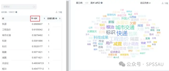文本分析模块中,最重要和最基础的为展示分词结果,通常是使用词云进行展示。在‘词云分析等’中,SPSSAU提供四种功能,分别是词云分析、自定义词云、词定位和tf-idf。