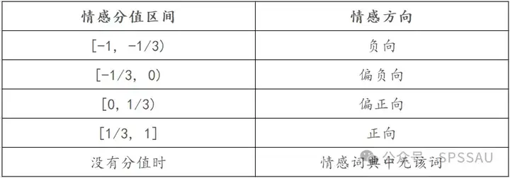 情感分析使用情感词典进行情感得分计算,并且经过SPSSAU数据压缩化,将情感得分压缩在-1~1之间。关于情感方向的判断标准具体规则如下表: