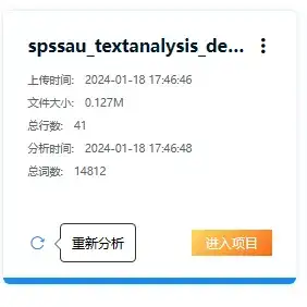 上传文本数据后,接着则需要对该数据(项目)进行分析。点击‘开始分析’按钮,项目则开始进行分析。如果完成分析后,‘开始分析’按钮会展示为‘进入项目’,也会展示‘重新分析’按钮,此时点击‘进入项目’即可查看对应的文本分析分析结果,比如词云分析情况等。类似如下图所示:
