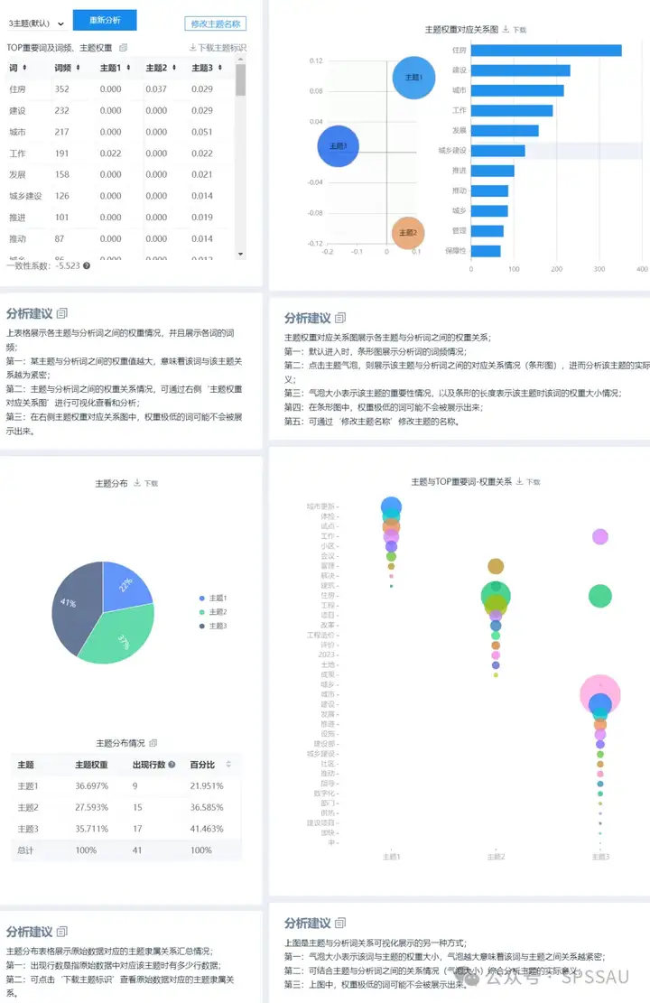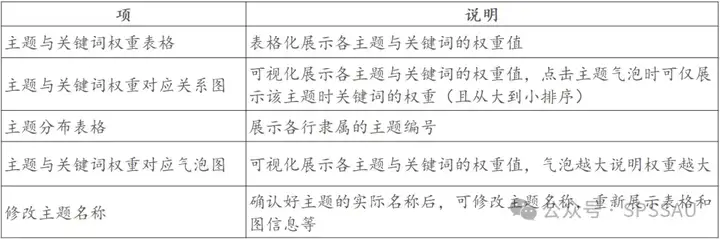 SPSSAU中呈现LDA主题分析包括如下内容或功能: