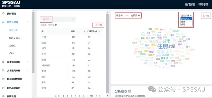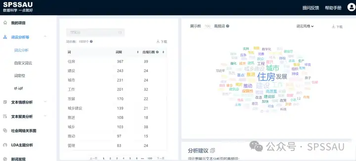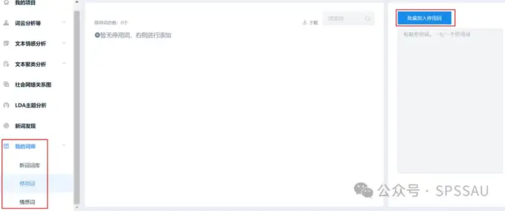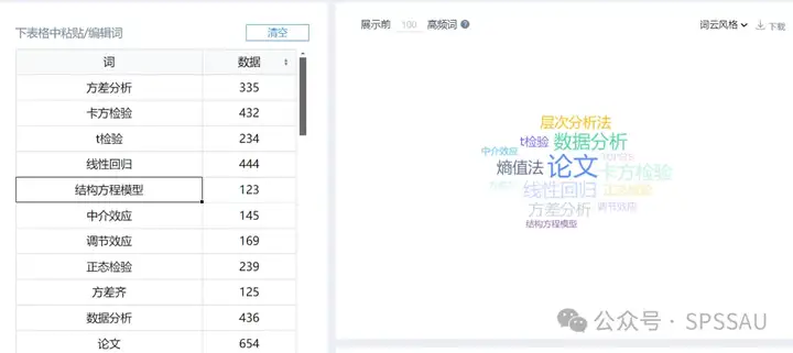 大学生必备的统计分析工具——SPSSAU在线数据分析软件,可以进行词云分析、文本情感分析、文本聚类分析、社会网络关系图绘制、LDA主题分析、新词发现、管理我的词库等文本分析。