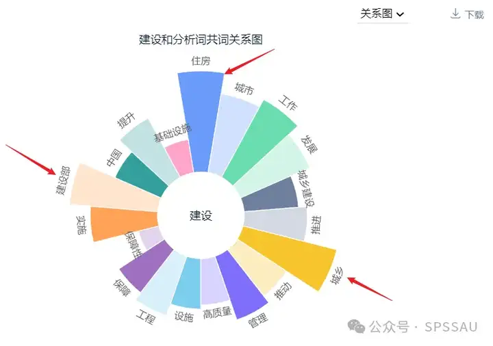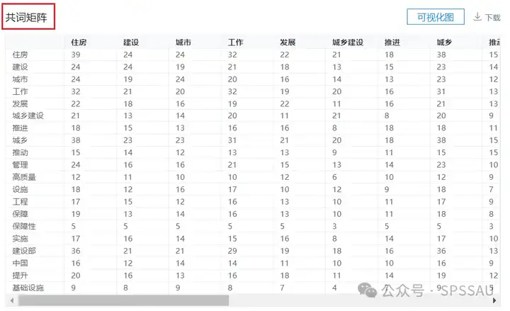 还可通过单击表格中的关键词,查看该关键词与其余分析词之间的共词次数情况,比如选中‘建设’这个关键词后,其出来结果如下,明显地可以看到,建设与‘建设部’、‘城乡’和‘住房’这三个词之间的关系较为紧密。
