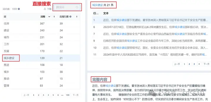 词定位可用于展示具体某个关键词在那些地方有过出现,比如本案例中‘城乡建设’这个关键词,研究者希望了解该关键词的具体出处信息等,**可直接点击该词,然后查看具体信息。**也可直接搜索想要查看的关键词,如下图所示: