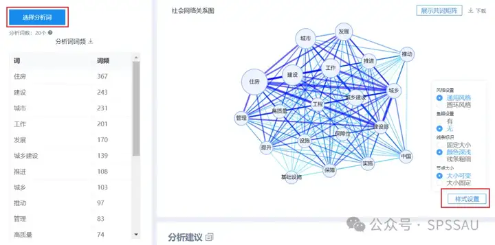社会网络关系图将共词矩阵信息进行展示,包括是否有共词关系(共词次数>0则有共词关系,等于0则说明没有同时出现过),共词次数情况等。默认情况下,系统会选中排名前20的关键词进行共词矩阵构建和社会网络关系图呈现,用户也可自由“选择分析词”。