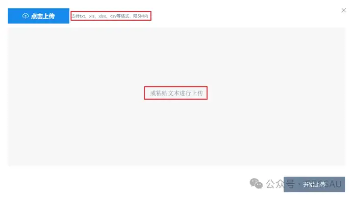 用户可**‘点击上传’自己的文本数据,在弹出对话框中,可实现直接粘贴文本**进行上传或者上传txt/excel/csv文件等。如下图所示: