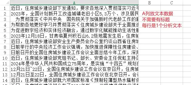 如果是通过excel格式(包括csv/xls/xlsx格式)时,**只需要1列数据,该列数据中包括文本数据,将文本全部放置于A列中,A列不需要有标题信息。**每行(即每个单元格)存在1个分析文本。如果是txt文档或者粘贴文本进行上传,那么系统会自动过滤掉空行数据,并且以回车键作为每行(即每个分析文本)标志。类似如下图所示: