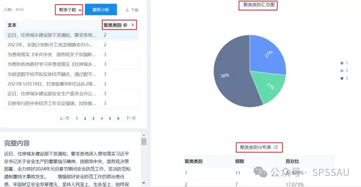 不同于按词聚类分析,按行聚类分析是指以‘行’为单位,针对每行数据进行聚类分析(具体为kmeans聚类),并且计算出各‘行’数据的聚类类别,也可直接进行下载聚类类别信息。SPSSAU分析结果如下图所示: