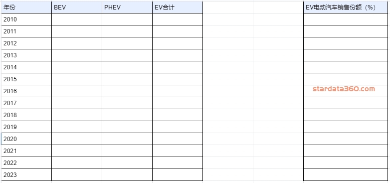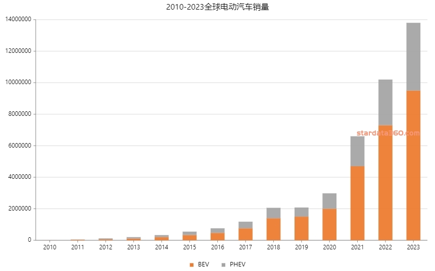 - 2010-2023全球电动汽车销量(分PHEV、BEV)