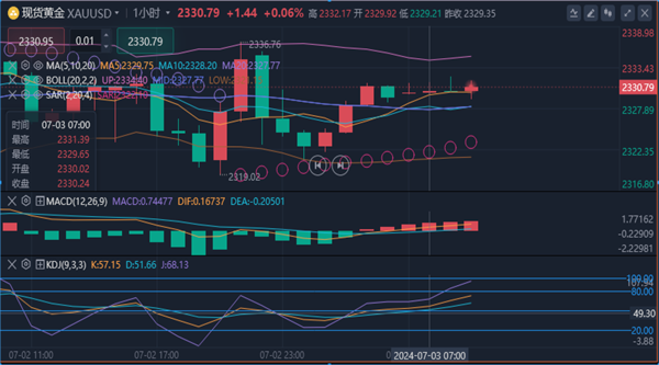 【黄金消息面分析】:周三(7月3日)亚市早盘,现货黄金窄幅震荡,目前交投于2331.15美元/盎司附近。金价周二震荡微跌0.11%,收报2329.15美元/盎司,美国职位空缺数据表现强劲,令金价承压,但美联储主席鲍威尔讲话偏向鸽派,美元和美债收益率下跌,又给金价提供支撑,当然金价整体呈现震荡走势,多数投资者开始等待本周晚些时候的美国就业数据提供更多降息线索。