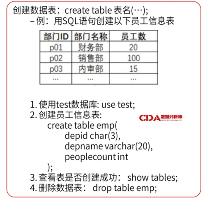 创建数据表:CREATE TABLE语句是DDL中最常用的命令之一,它允许用户定义数据表的名称、字段、数据类型及约束条件等。例如,创建一个员工信息表,需要指定员工的ID、姓名、职位等字段及其数据类型。