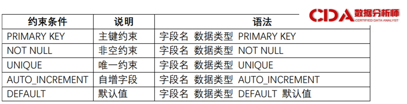 约束条件:如NOT NULL(非空约束)、UNIQUE(唯一约束)、PRIMARY KEY(主键约束)等,用于限制字段中数据的取值范围或格式,确保数据的准确性和唯一性。