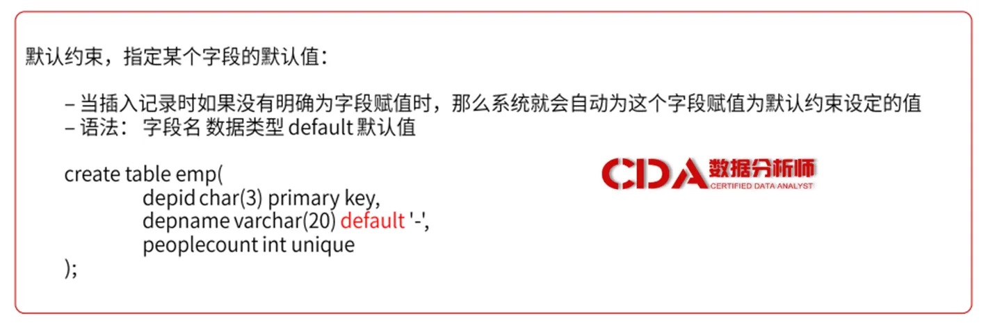 默认约束用于为表中的某个字段指定一个默认值。当插入记录时,如果某个字段没有显式地提供值,那么该字段将自动使用默认值。默认约束简化了数据插入操作,提高了数据处理的效率。