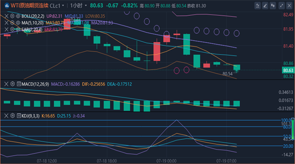 【原油消息面分析】:周五(7月19日)亚市早盘,国际油价窄幅震荡,美原油9月期货目前交投于80.79美元/桶附近。油价周四冲高受阻后下跌近1%,尽管对美联储降息的预期和EIA原油库存大减给油价提供支撑,但对美国经济放缓的担忧有所升温,令油价承压。