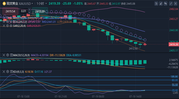 【黄金技术面分析】:黄金目前小区间暂定30分钟布林带上轨2479和下轨2445区间运行,向上破位看1小时布林带上轨阻力2488一线,向下破位看4小时MA10均线2450支撑点,同时4小时SAR指标延伸点上移来到2449位置,算是前期高点转变为支撑节点。4小时附图指标MACD红色量能柱开始逐步减弱,KDJ随机指标三轨粘合位于中间区域,上下都有空间,那么黄金上方压制并下调,还是维持高位对待即可。黄金整体操作上建议回调做空为主,上方关注2478-2483一线阻力,下方关注2425-2406一线支撑,后市有望再次回调2400大关口徘徊