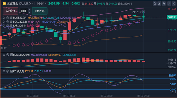 【黄金消息面分析】:周三(7月24日)亚市早盘,现货黄金守在2400关口上方,目前交投于2409.84美元/盎司附近。金价周二上涨0.55%,收报2409.39美元/盎司,终结了连续四个交易日的下跌走势,美国6月成屋销售降幅超预期,美债收益率下跌,给金价提供支撑;调查显示,美联储今年将降息两次,吸引逢低买盘持续支撑金价。