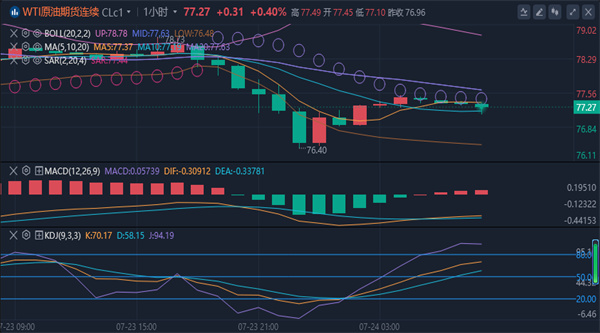 【原油消息面分析】:周三(7月24日)亚市早盘,国际油价窄幅震荡,美原油目前交投于77.40美元/桶附近。油价周二下跌约2%,盘中最低跌至六周低点76.40,原因是对加沙停火的预期升温,以及对亚洲大国需求的担忧加剧。不过,API原油库存连续四周大幅下降,略微缓解需求担忧,但要扭转跌势还存在一定的困难。