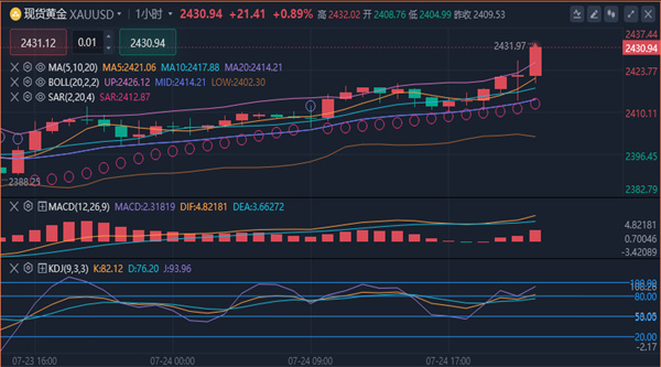 【黄金消息面分析】:在当前全球经济的复杂背景下,黄金作为传统的避险资产,其价格走势再次成为市场关注的焦点。周三(7月24日),黄金价格连续第二天回升,交易价格直逼2,420美元/盎司,这背后是市场对“滞胀”的担忧以及对美联储降息预期的不断升温。