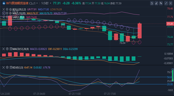 【原油消息面分析】:周四(7月25日)欧盘时段油价走低,因交易员权衡了喜忧参半的需求信号和库存数据。市场的焦点仍然是全球部分地区低迷的消费和即将公布的美国经济指标。WTI原油盘中报76.42美元/桶,跌幅1.51%。