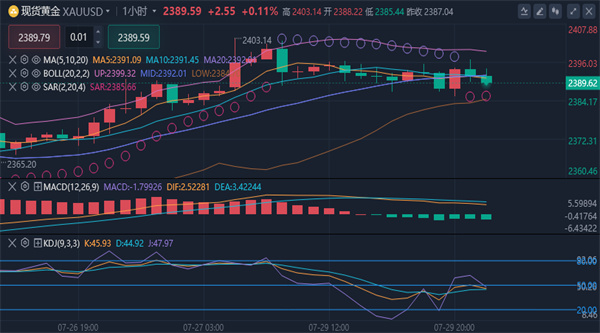 【黄金技术面分析】:黄金1小时均线还是死叉空头排列,开口还在张大,而且还没有任何拐头迹象,这也是我们本周重点需要留意的地方,黄金本周如果均线拐头,向上形成金叉,那么黄金才会反转,没有拐头迹象,基本上还是空头趋势,即使抗跌也会先震荡,然后用时间换空间,来把均线拉平然后拐头才有机会,所以本周操作还是不适合直接做多。本周首先关注均线阻力2391一线,其次关注2400关口阻力,本周在阻力下继续先承压看回落。综合来看,今日黄金短线操作思路上建议反弹做空为主,回调做多为辅,上方短期重点关注2405-2410一线阻力,下方短期重点关注2380-2375一线支撑。