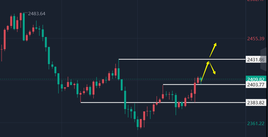 综合宏观经济环境的不确定性以及避险情绪的持续发酵,黄金作为避险资产的吸引力不断增强。盘面形态上的多次顶底转换及成功突破压力线,进一步确认了金价由弱转强的趋势。因此,日内交易策略应相应调整,由之前的承压看回落转变为支撑看反弹。重点关注2403一线的支撑力度,并围绕此线位布局反弹上行策略。上方阻力位可关注2425和2431等关键位置。今日黄金操作思路上文承凯建议低多看涨为主,操作建议:早盘2400附近看涨;反弹2429-30附近看跌;