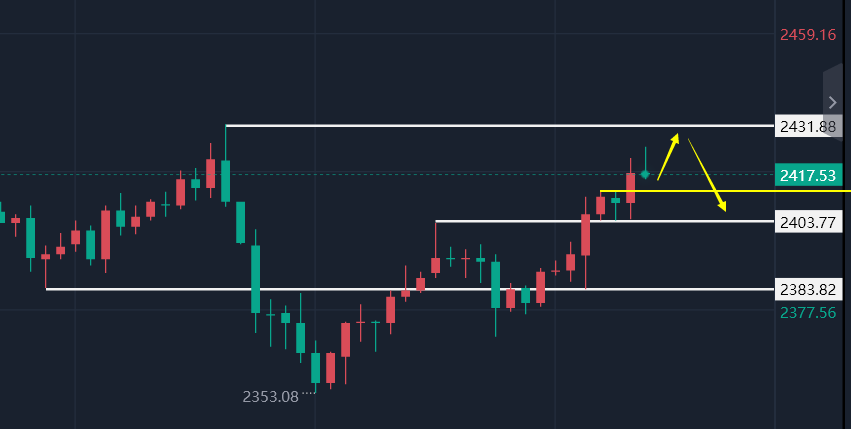 欧美盘建议:在2406附近看涨,上看2425附近,上方触及2430附近看跌,下看2415;