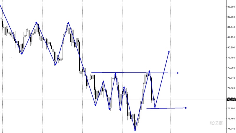 原油市场昨日开盘在79.08美元/桶,后行情先拉升,日线最高触及到了79.41美元/桶,后行情回落,日线最低给到了76.75美元/桶,后行情整理,日线最终收线在了77.4美元/桶,日线以一根下影线长于上影线的大阴线收线,而这样的形态收尾后,原油趋势面临调整。四小时级别上看,油价在布林带中轨遇阻后,回撤触及短周期均线附近徘徊,该水平是该水平重要支撑位,如果得到支撑出现多头拉升,将有望完成前一日我预期的三浪拉升走势,反之进一步回撤将考验前期起涨点防守价位。综合以上分析,张亿富认为:原油一涨二调,有望形成三浪加速,今日操作上考虑回撤布局多单为先,高空为辅,上方关注78.2-78.9美元阻力,下方关注76.0-75.0美元支撑。