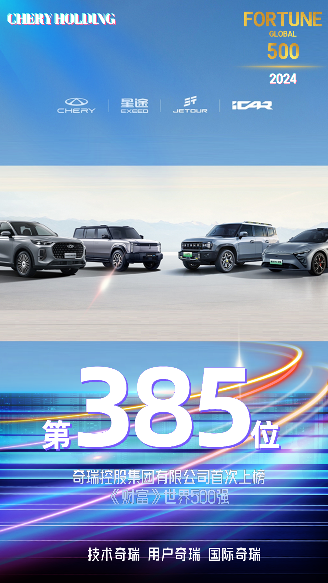 8月5日,2024年《财富》世界500强出炉,不出意外,奇瑞以385位的较高排位,首次入围世界500强。此前,在《财富》中国500强排行榜中,奇瑞控股集团有限公司以390.917亿美元营业收入登榜,位列排行榜第100位,比2023年大幅上升68位次。