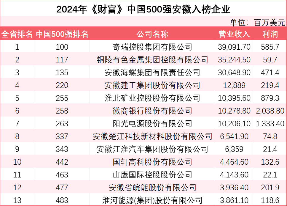 今年安徽有2家企业登榜