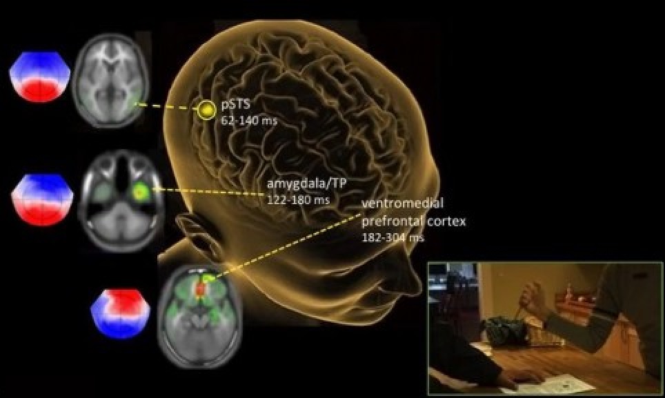 首先,对裂脑患者(切断大脑胼胝体导致大脑左右半球分离的病人)的研究工作推动了道德的神经系统研究(R. Soc. Open Sci. 4:170172)。对意外或手术造成的裂脑患者的道德感的研究表明:右脑对于基于意图的道德判断是充分和必要的部分。道德感是一种理性化思维,比如对待同样一种违反道德的欺骗行为,如果大脑判断该欺骗是故意的,那其道德感的反应会比“善意的谎言”要强烈地多。研究者还让测试者观看意外伤害和故意伤害的视频,他们发现,故意伤害会立即在大脑中产生反应,在60毫秒内,位于大脑后部的右侧颞后上沟(PSTs)首先被激活,随后杏仁核(通常与情感有关)和腹内侧前额叶皮层被激活(180毫秒),这是大脑道德判断中起关键作用的部分。然而当测试者看到的是意外伤害时,杏仁核和腹内侧前额叶皮层则没有激活反应(如图2所示)。