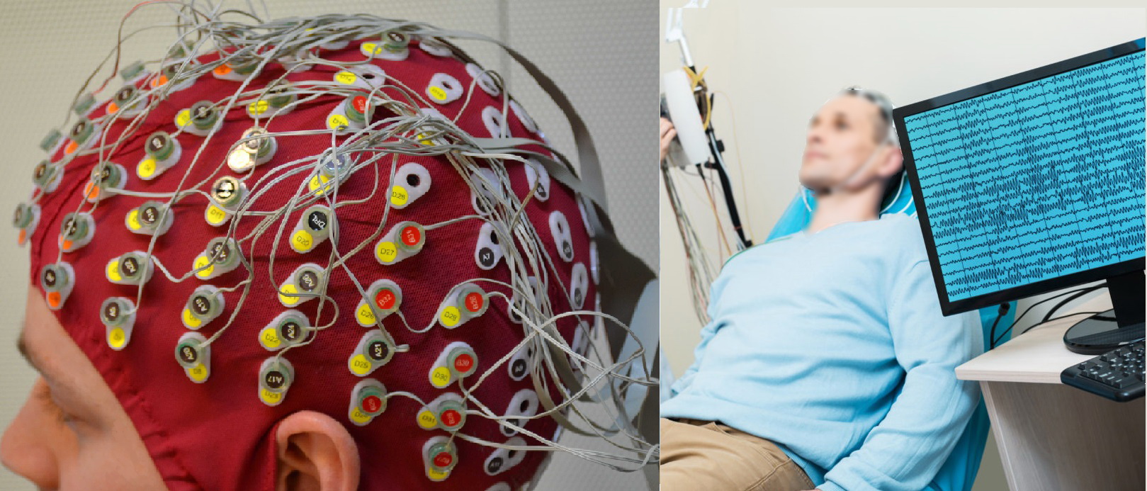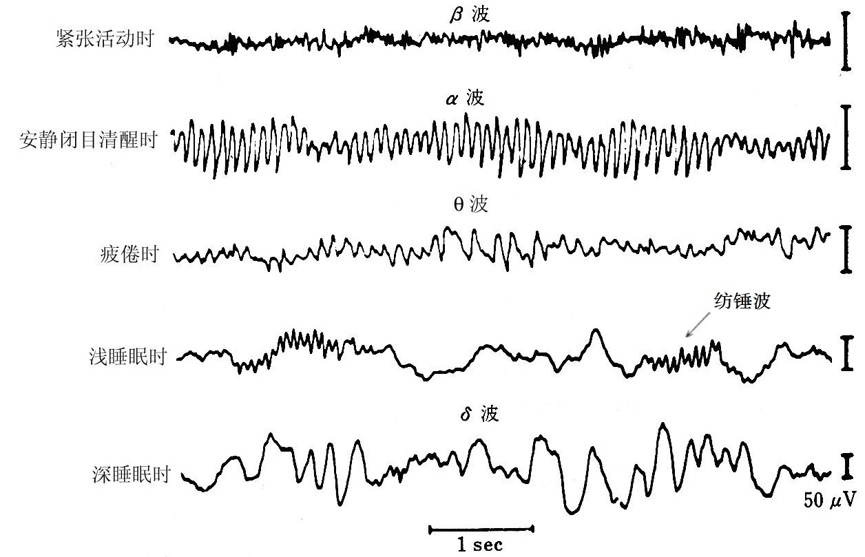 首先,人们注意到人在做梦的时候脑电波与清醒时不同。大脑神经元细胞在同步放电的时候,周围会产生微弱的电场和磁场(电磁场)变化,而这种变化的电磁场就是所谓的脑电波。脑电波可以被附近的电极感应而产生电信号,这些电信号可以用来实时记录电极附近区域神经元的放电活动,这就是著名的脑电图(Electroencephalography,EEG)。脑电图和心电图类似,是记录大脑皮质层电信号即神经元宏观电活动的图像信息,目前脑电图已是非常成熟的技术,在脑功能状态监测和脑疾病评估方面具有广泛应用(比如癫痫的诊断和定位)。