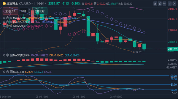 【黄金消息面分析】:周三(8月7日)亚市早盘,现货黄金延续隔夜跌势,目前交投于2383.43美元/桶附近。因市场对经济即将衰退的担忧有所缓解,周二美元走强和债券收益率反弹,金价回落至2400关口下方,盘中最低触及2381.50美元/盎司,收报2389.72美元/盎司,尽管对美国9月降息的预期和中东地缘政治紧张局势升级仍给金价提供一些支撑。
