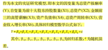 因变量为总资产报酬率(Y)、自变量为前十大股东持股数量(X1)、总资产(X2)、金额前三的高管薪酬(X3)、资产负债率(X4)、总资产周转率(X5)、营业收入增长率(X6)