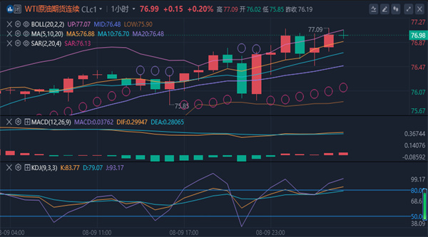 【原油消息面分析】:周五(8月9日)欧盘时段,WTI原油在触及75.85美元每桶的低位后反转上涨,盘中报76.51美元每桶,涨幅0.42%。最近的美国就业数据缓解了对经济放缓的担忧。美国上周初请失业金人数降幅大于预期,显示就业市场有弹性。这种积极的经济前景支持了对石油需求的预测。