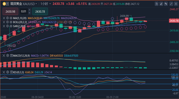 【黄金消息面分析】:周五(8月9日),现货黄金在欧盘早盘触及2416.77美元低点后回升,盘中报2429美元/盎司,涨幅0.08%。过去七天,金价波动加剧,从此前一周周五的高点跌至周一的低点,跌幅为4.4%,之后又从低点上涨2.5%。金价周四的反弹大部分与股市大涨同步,因上周初请失业金人数有所改善。