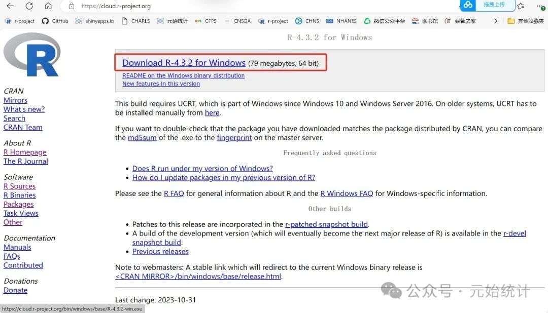 1 打开网址:The Comprehensive R Archive Network (r-project.org),点击下载链接【Download R-4.3.2 for Windows】跳转到下载页面