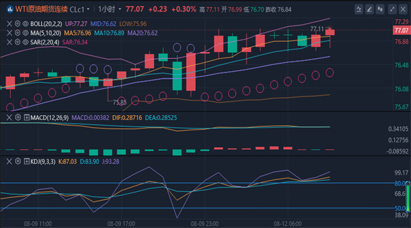 【原油消息面分析】:周一(8月12日)亚市早盘,国际油价守在逾一周高位附近,美原油目前交投于76.83美元/桶附近。上周五油价收高至一周高位,周线涨幅超过3.5%,积极的经济数据和美联储决策者可能最早于9月降息的信号缓解了需求担忧。