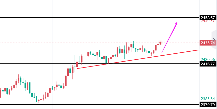 此外,本周还将迎来关键的CPI数据公布,该数据有望对市场短期走势产生重大影响。因此,在周三CPI数据公布后,我们建议投资者根据最新市场情况适时调整交易策略。对于周一的日内交易,早盘金价稳定在2420上方,显示出市场的强劲态势。操作思路上文承凯建议黄金在2420-25附近做多看涨,上方目标可设为2440和2450。