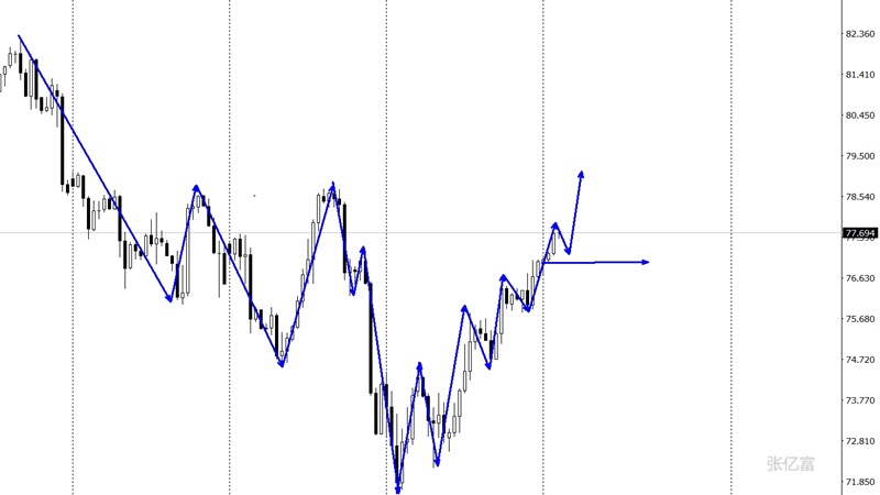 原油市场昨日早盘小幅低开在76.96美元/桶,日线最低给到了76.77美元/桶,后行情强势拉升,日线最高触及到了80.23美元/桶,后行情整理,日线最终收线在了79.73美元/桶,后行情以一根上影线很长的大阳线收线,而这样的形态收尾后,原油延续看涨中。原油四小时级别上看,昨日行情继续延续反弹走势目前已经到均线的压力位,我们从下方的幅图MACD可以清楚的看到依然还在零轴下方运行多头能量发散,油价受中东方面的影响,油价有进一步上探的概率。综合以上分析,张亿富认为:原油上涨突破,依旧处于宽幅震荡中,今日操作上考虑回撤布局多单为主,上方关注80.5-82.3美元阻力,下方关注78.3-77.7美元支撑。