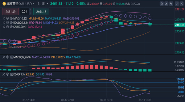 【黄金技术面分析】:黄金周一延续上涨走势与预期一样,不过上涨幅度超过了预期,周一行情早盘回踩2423一线后开启逼空上涨,日内上涨基本上没有过多的回踩,日内最高上涨至2472一线,日线收实体大阳线,高点触及上轨附近,暂时承压上轨,2477形成双顶,今日早盘黄金小幅回落,目前来看到了比较关键的位置,今日行情是在2477双顶形态直接回落,还是调整后直接拉升创新高。黄金4小时级别和日线级别保持多头格局,但短线出现高位滞涨格局,小时图连续冲高试探高点,最终也未能形成强势上涨,视为横盘修正,而这种修正,还是多头趋势的中继修正,短线主思路,仍然主多。综合来看,今日黄金短线操作思路上回调做多为主,反弹做空为辅,上方短期重点关注2475-2480一线阻力,下方短期重点关注2445-2440一线支撑。