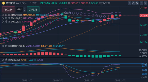 【黄金技术面分析】:黄金周一延续上涨走势与预期一样,不过上涨幅度超过了预期,周一行情早盘回踩2423一线后开启逼空上涨,日内上涨基本上没有过多的回踩,日内最高上涨至2472一线,日线收实体大阳线,高点触及上轨附近,暂时承压上轨,2477形成双顶,黄金4小时级别和日线级别保持多头格局,但短线出现高位滞涨格局,小时图连续冲高试探高点,最终也未能形成强势上涨,视为横盘修正,而这种修正,还是多头趋势的中继修正,短线主思路,仍然主多。总体走势的预判,黄金目前围绕以2440-2445为支撑,2475-2480为压制的高位区间波动为主,破位看2490-2500。综合来看,今日黄金短线操作思路上回调做多为主,反弹做空为辅,上方短期重点关注2478-2483一线阻力,下方短期重点关注2458-2453一线支撑。