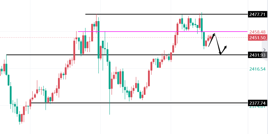 日线结构来看,连续三日大阳回升近百美金,紧随出现2-3日回修调整不足为奇,昨日阴线下跌近40美金,跌破5日线,短线行情就有进一步回撤调整的可能性,今日可着重关注下方10日线2433-30一带测试情况,倘若今晚数据再被市场拿来炒作,那么黄金跌至20日线2420附近也都是存在可能性的。结合小时图走势,日内黄金大概率会有一定的延续调整趋势,白盘时段上方着重关注2460一带压力,下方关注2430支撑再回撤。