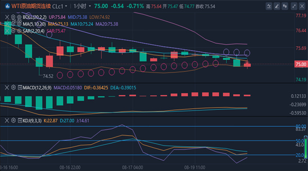 【原油消息面分析】:周一(8月19日),原油市场走软,全球原油市场的需求调整令市场信心承压;于此同时,投资者关注中东停火谈判谈判的进展,这可能降低供应风险。截至北京时间15:52,布伦特原油期货LCOc1下跌0.42美元或0.53%,至每桶79.26美元。美国西德克萨斯中质油(WTI)期货CLc1下跌0.44美元,跌幅0.6%5,至每桶75.05美元。