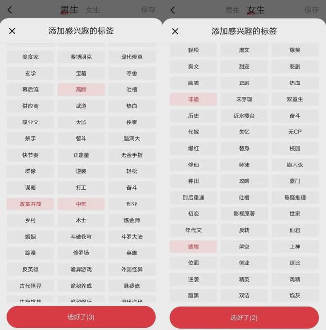 在新用户选择内容偏好时,除了男女性别标签以及常见类型外,起点读书平台还囊括了大量次级标签,包括“高龄”、“中年”、“婆媳”等与中老年用户群强关联的内容标签,标签丰富度高于其他平台。
