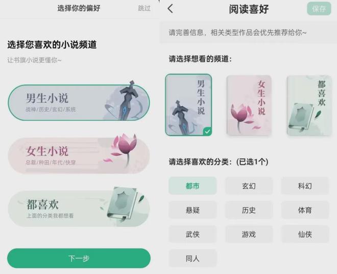 与其他同类型APP相比,书旗的标签功能相对简洁,仅有性别标签以及10个主要类型标签。在阅读体验上,内置了护眼模式、极简模式、亮度自适应等常规功能。
