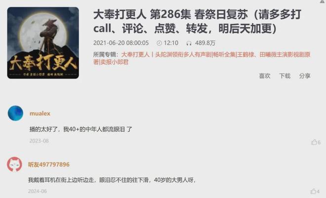 此前阅文与腾讯音乐集团、喜马拉雅等平台合作,制造出多部爆款有声内容,其中《大奉打更人》有声作品上线两个月全网播放量突破4000万。在喜马拉雅上,一些中老年用户听完有声剧后纷纷留言,为作品应援。