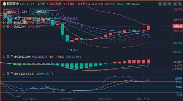 【黄金消息面分析】:周四(8月22日),金价下跌超过1%,收盘报每盎司2,483.29美元。在杰克逊霍尔研讨会之前,受美元反弹和公债收益率上升的打压,黄金出现较深幅度的获利回吐调整。